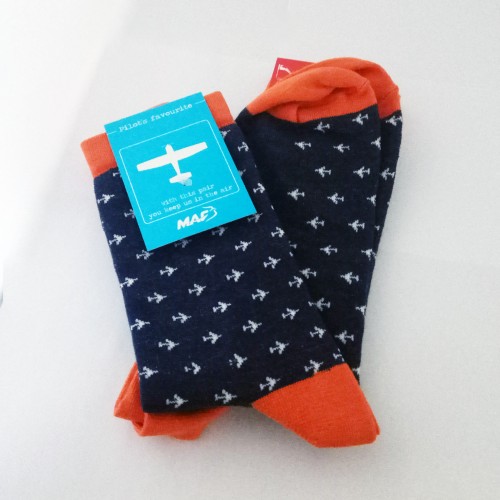 Donkerblauwe sokken met witte vliegtuigen. Oranje rand en hak.
